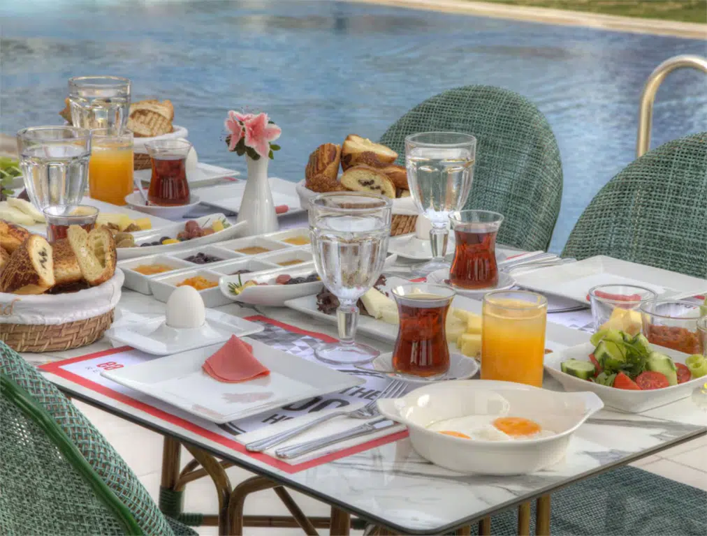 Her sabah 09.00 – 11.30 saatleri arasında, Ege'nin taze ürünlerinden oluşan "yerel tarzda" serpme kahvaltı sunulur.